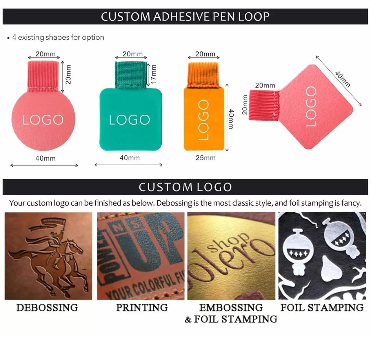 Jin Sheu ist ein vertrauenswürdiger globaler Anbieter von selbstklebenden Stifthaltern in großen Mengen, der umfangreiche Anpassungsmöglichkeiten bietet. Wählen Sie aus vier vorgefertigten Formen: Kreis, Quadrat, Rechteck und Diamant oder fordern Sie vollständig maßgeschneiderte Größen an. Um Ihren Markenstil zu entsprechen, bieten wir mehrere PU-Ledertexturen an, darunter Kreuz, Litchi, glatt, Holz, Krokodil, Köper, wachsbeschichtet, vintage, Perle und Schlangenleder. Kombiniert mit starken elastischen Schlaufen und zuverlässigem 3M-Kleber bieten unsere Stiftschlaufen konsistente Qualität und zuverlässige B2B-Leistung.