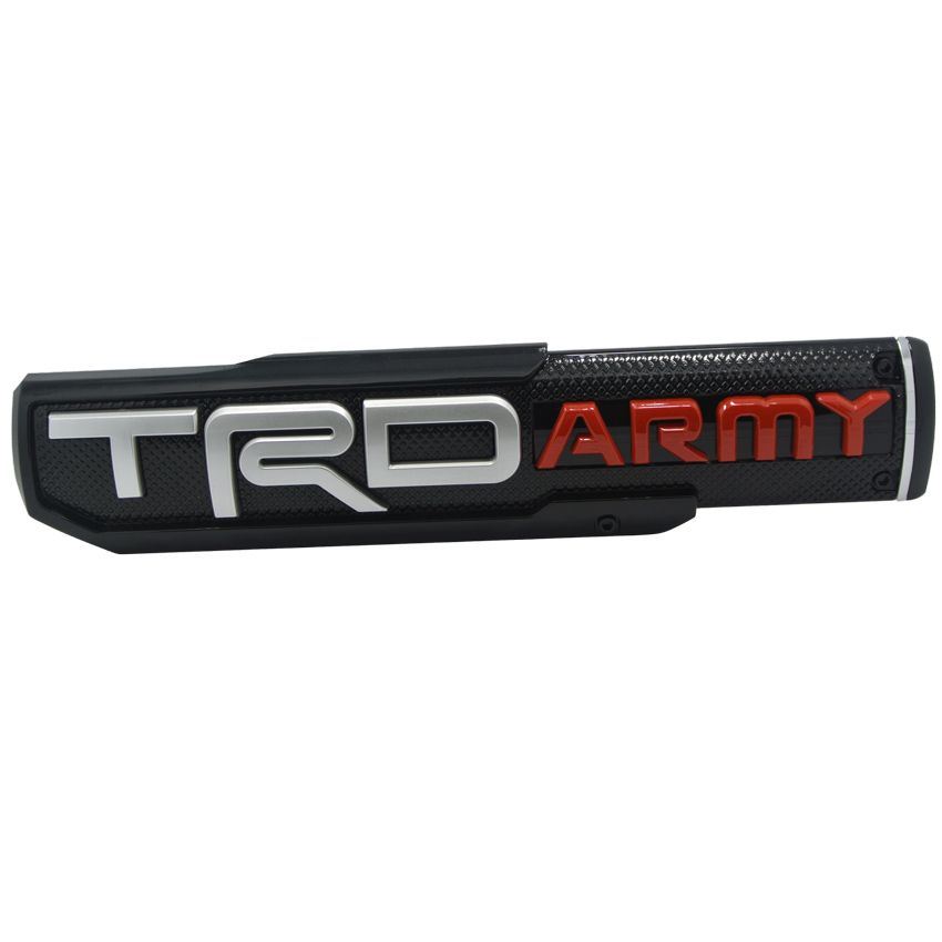 Die untere ABS-Basis ist schwarz lackiert, um eine saubere und langlebige Grundlage zu bieten. Der obere rechte Text, "ARMY", ist rot lackiert, während der obere linke Text, "TRD", mit einer satin-silbernen Elektroplattierung für ein raffiniertes metallisches Aussehen versehen ist. Rillen sind in das Basisbauteil eingearbeitet, sodass die beiden Textelemente genau eingesetzt und sicher fixiert werden können, um eine konsistente Ausrichtung und langfristige Haltbarkeit zu gewährleisten.