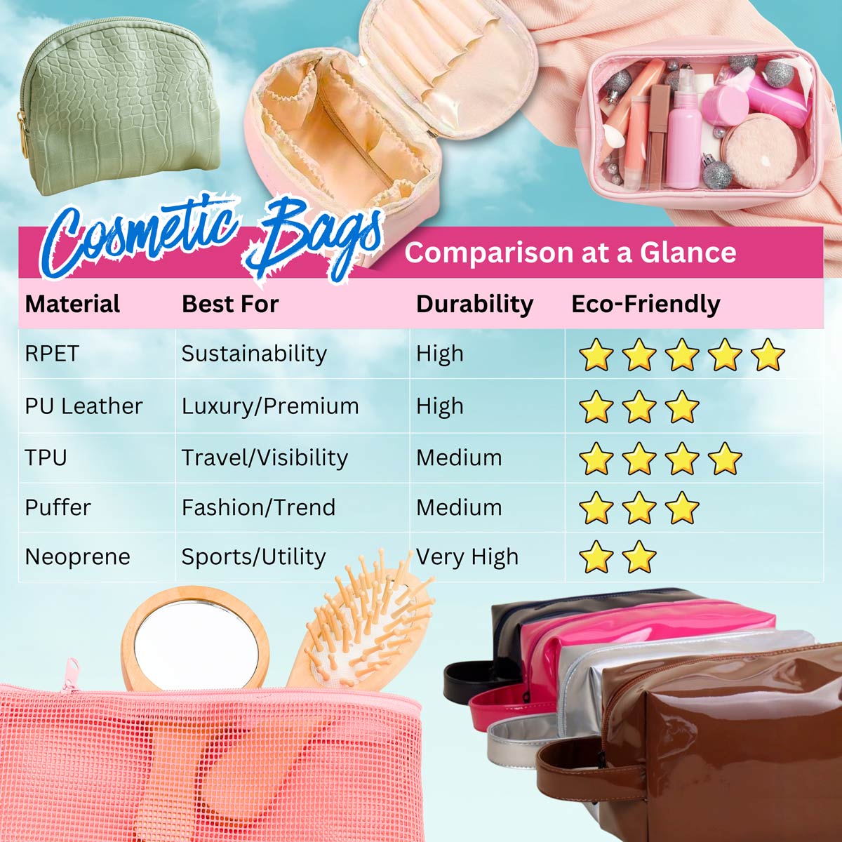 Selecting the perfect material is a critical step in aligning your make up bag with your target market's expectations. Our comprehensive material offers a strategic range of options, from high-durability Neoprene for rugged utility to premium PU Leather for a luxury retail experience. For brands prioritizing environmental responsibility, our cosmetic bags with RPET fabrics provide a top-tier sustainable solution without compromising on strength. Meanwhile, our TPU and Puffer options offer the perfect balance of visibility and on-trend aesthetics for seasonal promotions. Use the comparison chart below to evaluate which beauty bag material best suits your requirements for durability, eco-friendliness, and brand positioning.