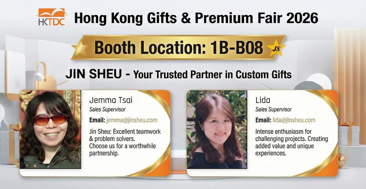 At the HKTDC Gifts Hong Kong Fair 2026, Jin Sheu presents Jemma Tsai, Sales Supervisor, and Lida, Sales Supervisor, representing our teamwork-driven culture and problem-solving spirit. Jin Sheu is a collaborative manufacturing family committed to supporting clients through clear communication, reliable execution, and value-focused solutions. Jemma ensures smooth coordination and dependable project delivery, while Lida brings strong enthusiasm and expertise in handling complex custom gift projects, creating added value and brand experience. Together, they showcase Jin Sheu’s proven capability in customized metal, embroidery, and leather gift solutions for global buyers—and why we are truly worth working with.