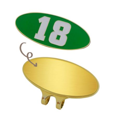 This oval-shaped hat clip is composed of 2 parts, a blank iron-based clip with a center recessed and a custom oval-shaped logo which is the number "18” in this case. The custom logo is also made of iron and is then stuck to the blank base firmly. The blank hat clip is one of our existing models and the oval logo emblem is 100% customizable. There is no magnet embedded on the hat clip, so the ball markers that go with this model must be designed with a magnet embedded.