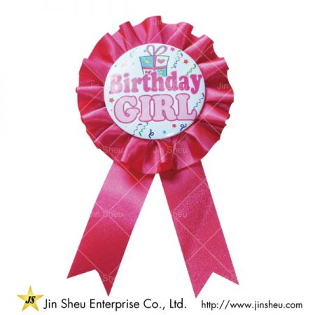 Factory direct rosette award ribbons at wholesale prices. Thick and durable rosette ribbons are folded and pleated neatly. Text can be foil printed nicely on the ribbon streamers and on the tin buttons. Any custom sizes are available.