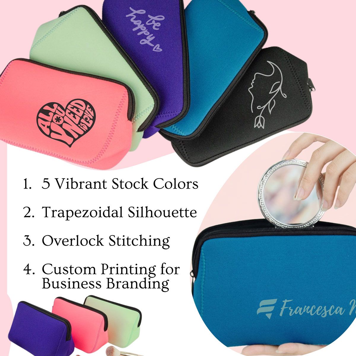 - Application: Cosmetic storage, travel pouch, promotional giveaway
