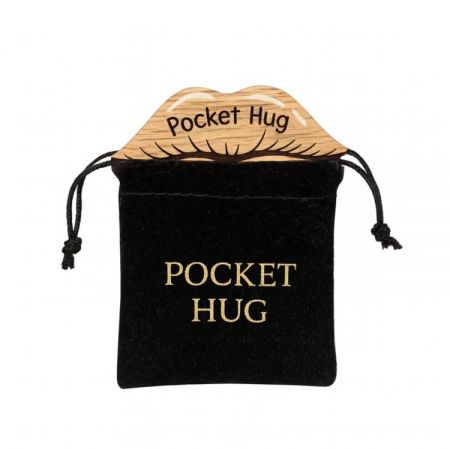 Lips themed wooden pocket hug token in black velvet drawstring bag for stylish sympathy gift