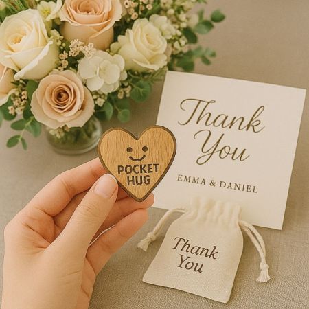 Heart shaped pocket hug gift with thank you card for wedding guests custom engraved wood keepsake