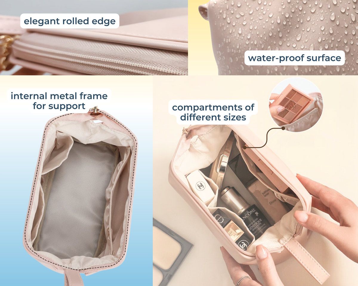 This structured PU leather makeup bag is ideal as a travel cosmetic organizer or for daily use. It offers ample storage space with three compartments in different sizes for easy organization. The smooth zipper closure features a metal zipper pull, while the opening is reinforced with an internal metal frame for added support and shape retention. The waterproof PU leather surface helps protect items stored inside. Finished with neatly rolled edges, the bag is crafted with refined detailing that conveys a clean, elegant appearance.