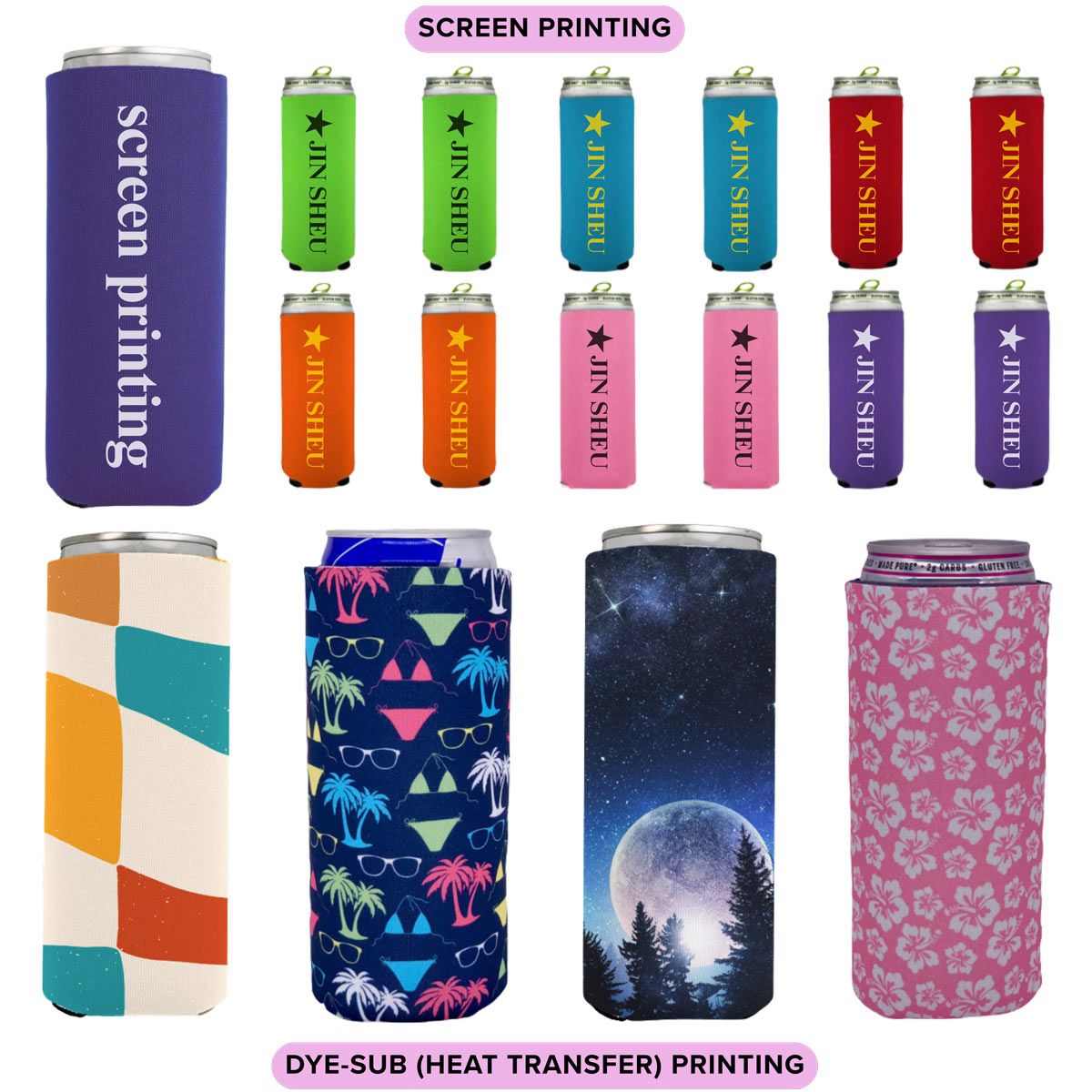 Offriamo due metodi di stampa principali per dare vita ai tuoi design di koozie per birra slim: 1) Stampa Serigrafica: Ideale per loghi semplici con un numero limitato di colori solidi. Questo metodo consente una precisa corrispondenza dei colori PMS, garantendo che i colori del tuo marchio siano riprodotti con accuratezza. 2) Stampa a sublimazione a colori completi: Perfetta per design complessi e avvolgenti. Questo processo è eccellente per immagini fotorealistiche, schemi intricati e sfumature, consentendo possibilità di colore illimitate.
