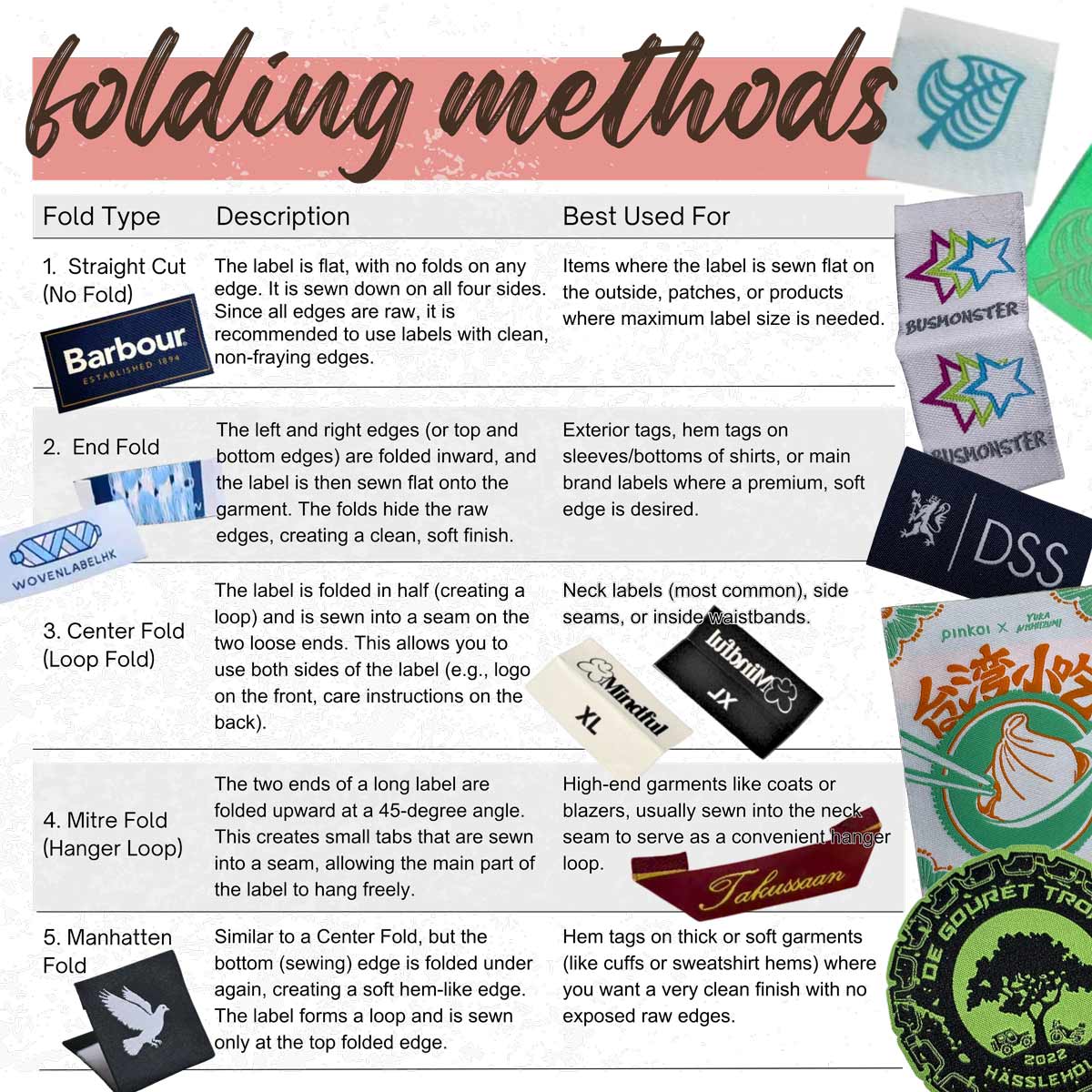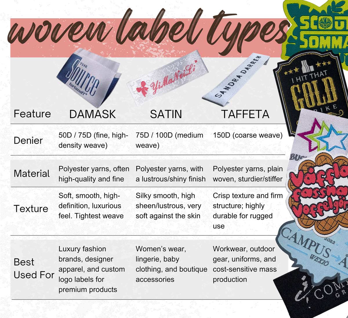 - 타프타, 새틴 또는 다마스크로 직물 의류 라벨을 제조하며, 최고의 세부 사항을 제공합니다.