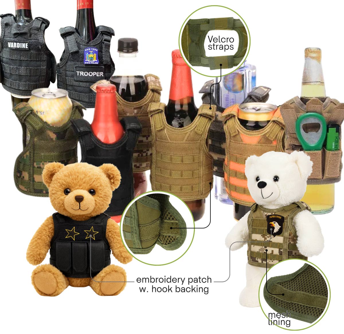Esses coolers de lata de cerveja em estilo militar são mais do que apenas suportes para bebidas—são versáteis, funcionais e divertidos! Cada mini colete possui tiras de Velcro que podem segurar com segurança patches bordados personalizados ou etiquetas de nome, permitindo uma fácil personalização. Além de manter suas latas, garrafas ou água geladas, esses mini coletes também podem ser usados para vestir animais de pelúcia ou armazenar pequenos itens essenciais, como abridores de garrafa, isqueiros ou chaves nos bolsos frontais. Feito com tecido de nylon durável e forro de malha respirável, eles combinam um design militar robusto com criatividade lúdica—perfeito para presentes, coleções ou itens promocionais que se destacam.