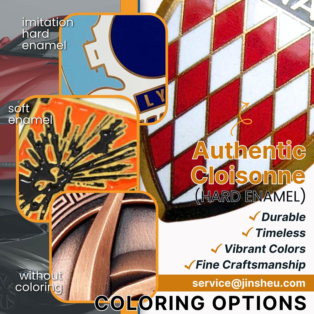Huy hiệu lưới xe tùy chỉnh có sẵn với các chất liệu cloisonné, men cứng giả, men mềm, hoặc hoàn thiện chỉ bằng kim loại cổ điển
