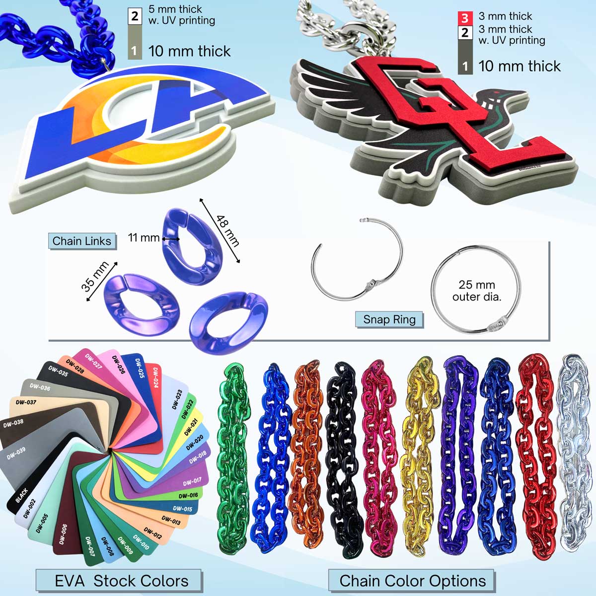 Dây chuyền xích bằng foam EVA tùy chỉnh với mặt dây chuyền lớn và thiết kế logo nổi bật, được trưng bày trên nền trắng.